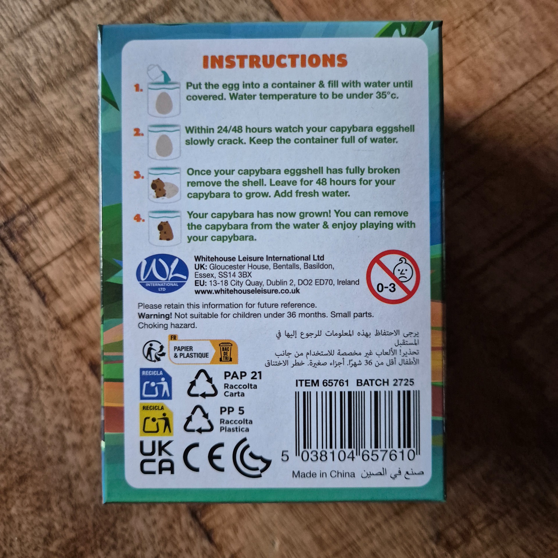 Nieuw "Hatch and Grow Capybara" ei. Dit is een speeltje waarbij je een ei in water legt en wacht tot er een capybara uitkomt en groeit.