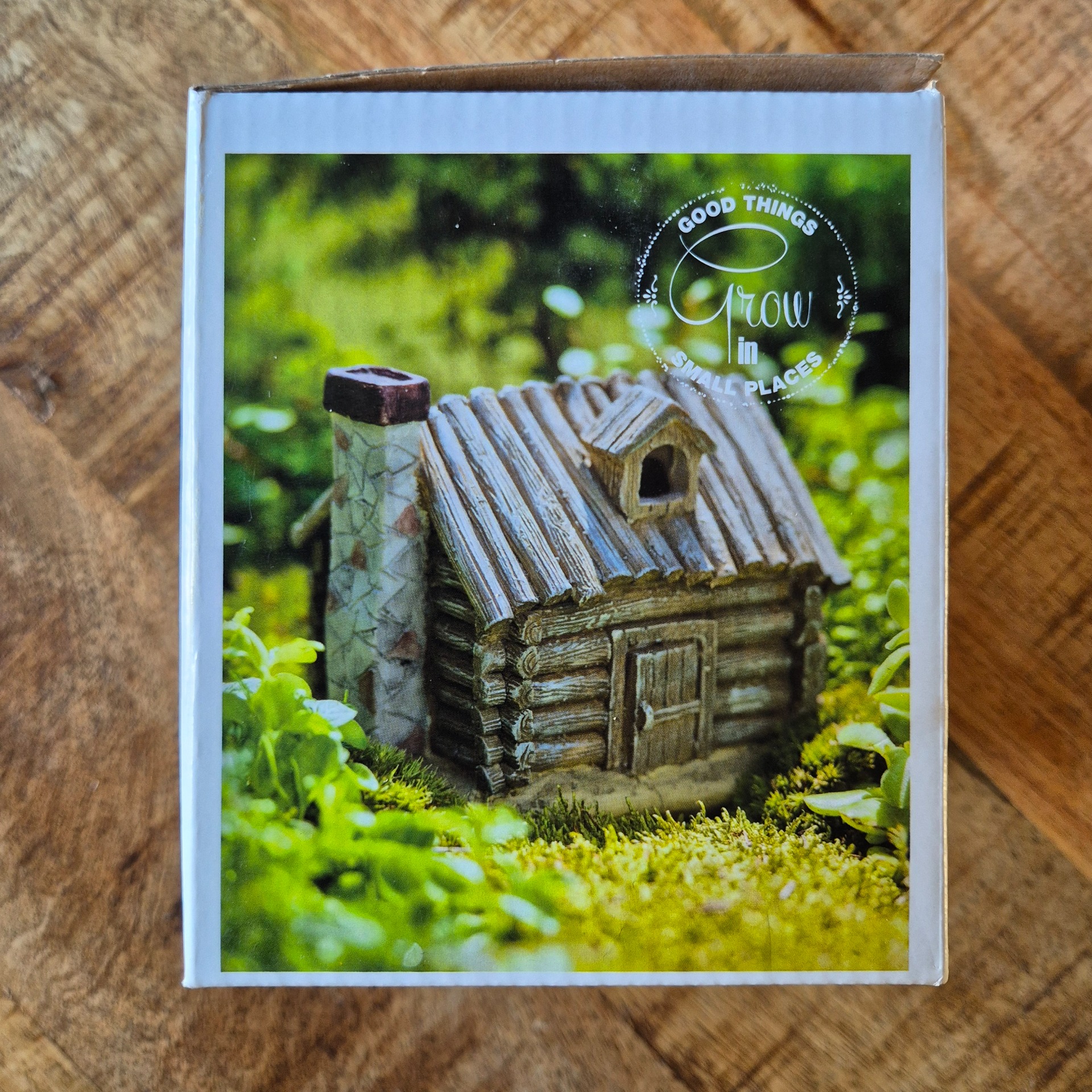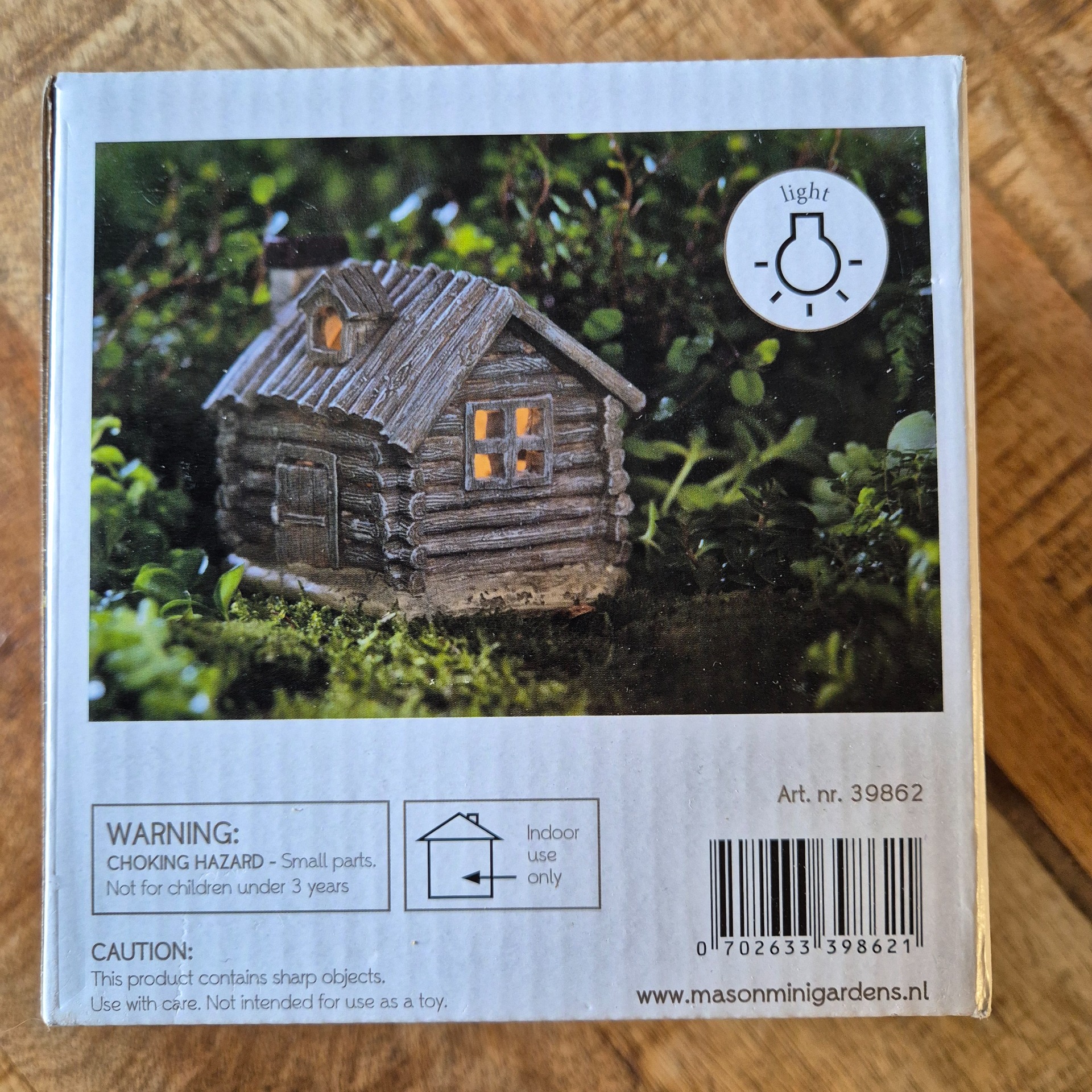 Dit is een nieuw decoratief "Log house" van het merk Mason Mini Gardens. Het is een miniatuurhuisje met ingebouwde verlichting, bedoeld voor gebruik in miniatuurtuinen of als onderdeel van een kerstdorp.