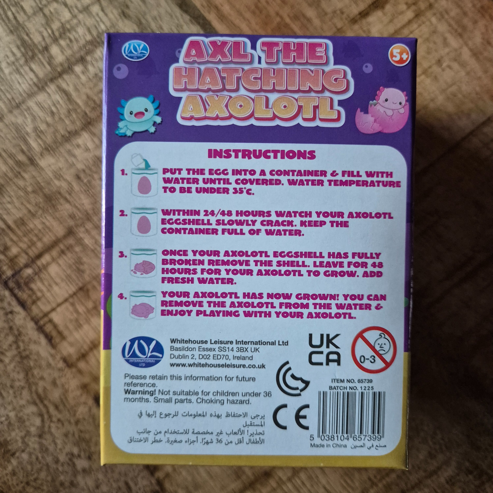 Nieuw in de verpakking een Axl The Hatching Axolotl. Dit is een uitbreidbaar waterspeeltje waarbij een klein axolotl-figuurtje uit een ei 'groeit' wanneer het in water wordt geplaatst.